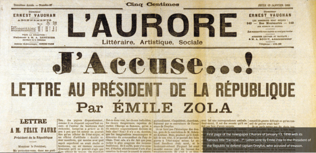 A letter can contain a powerful message. Indeed, some letters have changed the course of history. One such letter was written on January 13, 1898 by Emil Zola and published in the French newspaper L’Aurore. The letter was titled J’accuse which translates to I accuse. As a result of this letter, the sham trial and subsequent sentencing of Albert Dreyfus to the infamous Devil’s Island was reversed. A further result of this famous letter was a public backlash against Antisemitism. The effects of this letter and the relevance of the Dreyfus affair remain relevant in France to this very day. An English translation of Zola’s letter, which is considered to be a masterpiece, can be found here.